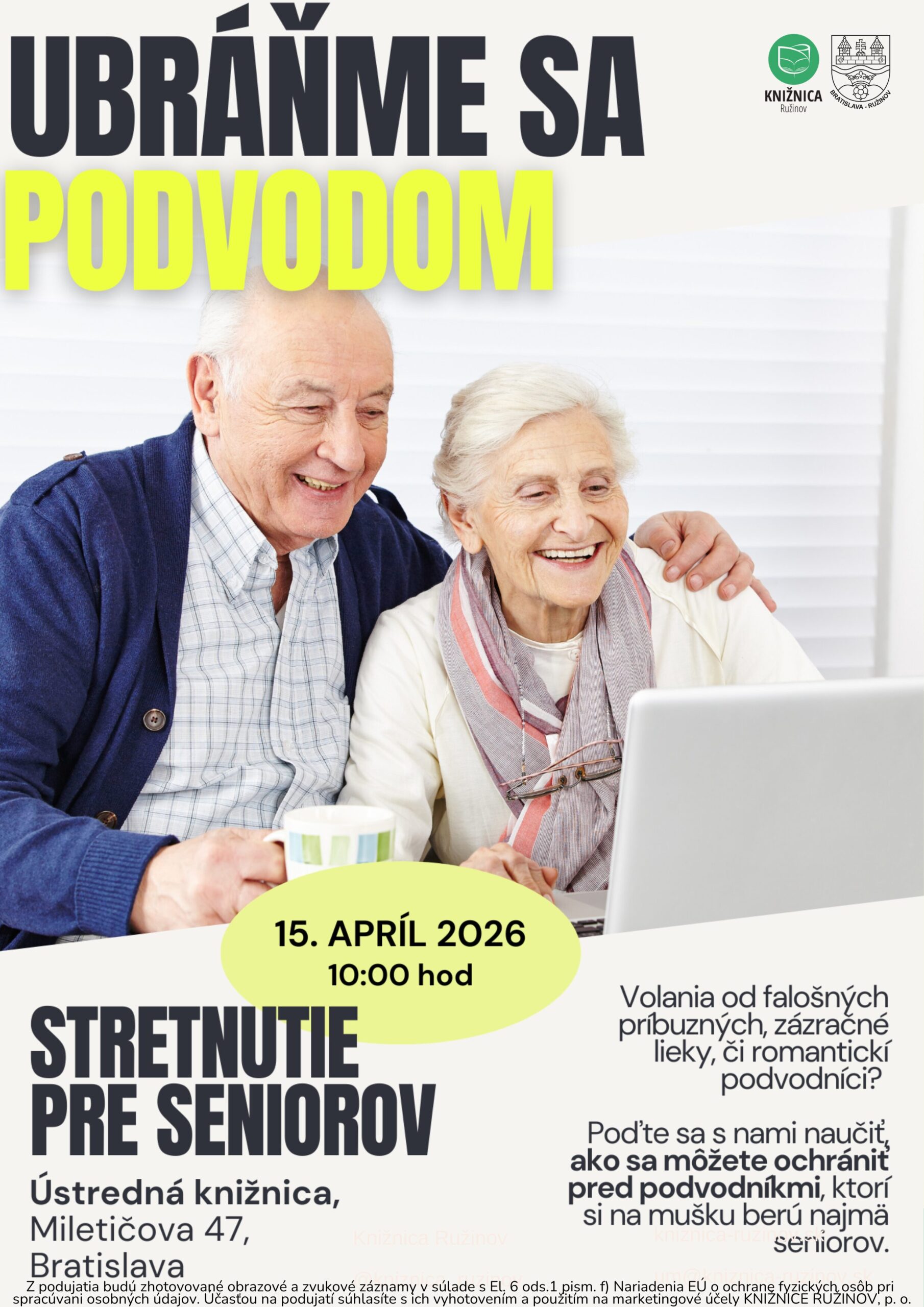 3. apríla 2026Ako sa brániť voči praktikám podvodníkov? Aké sú najčastejšie podvody? Odpovede na tieto a ďalšie otázky dostanete na podujatí Ubráňme sa podvodom.